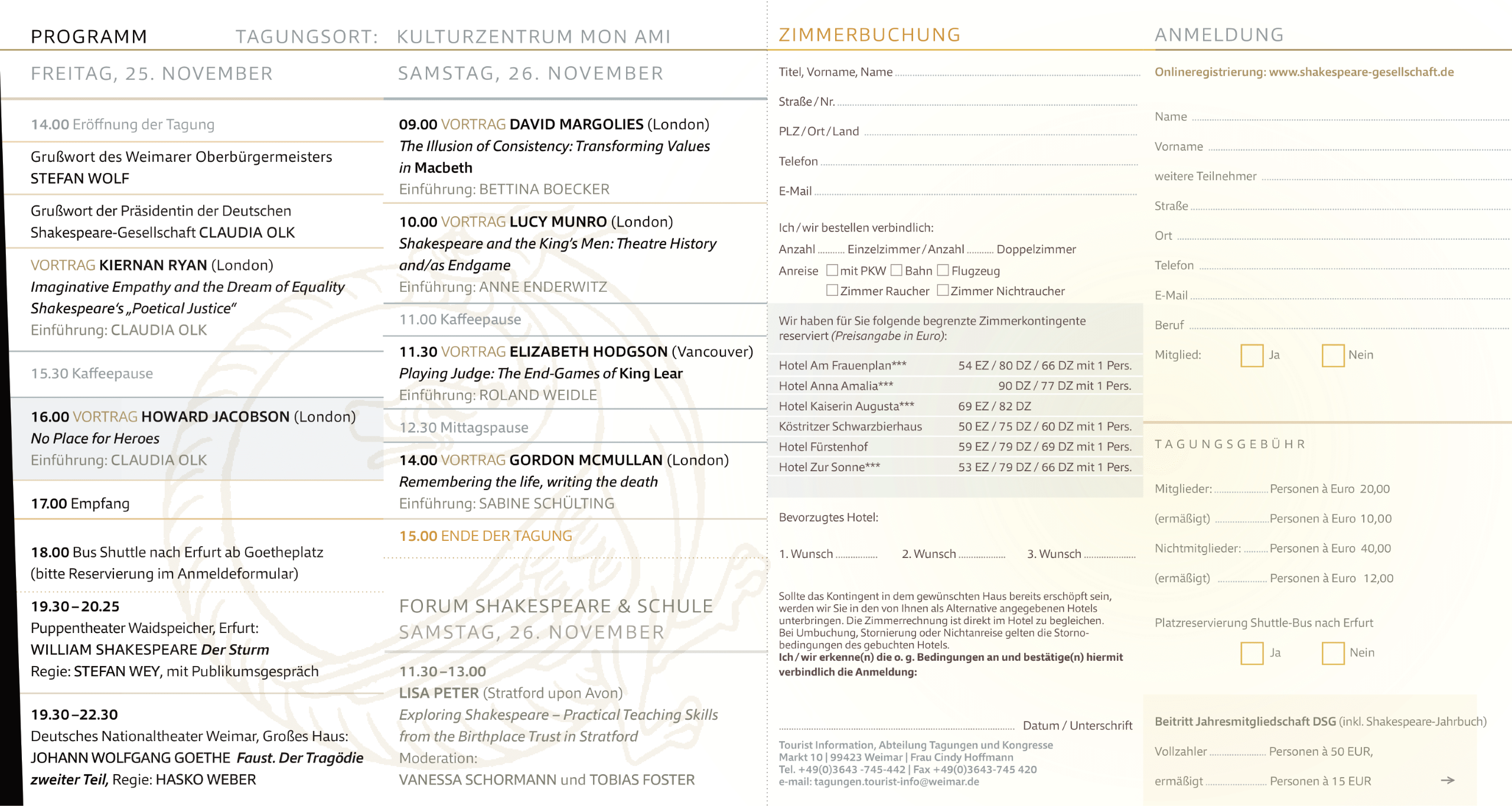 Die Herbsttagung der Deutschen Shakespeare-Gesellschaft findet vom 25. bis 26. November 2016 in Weimar statt.