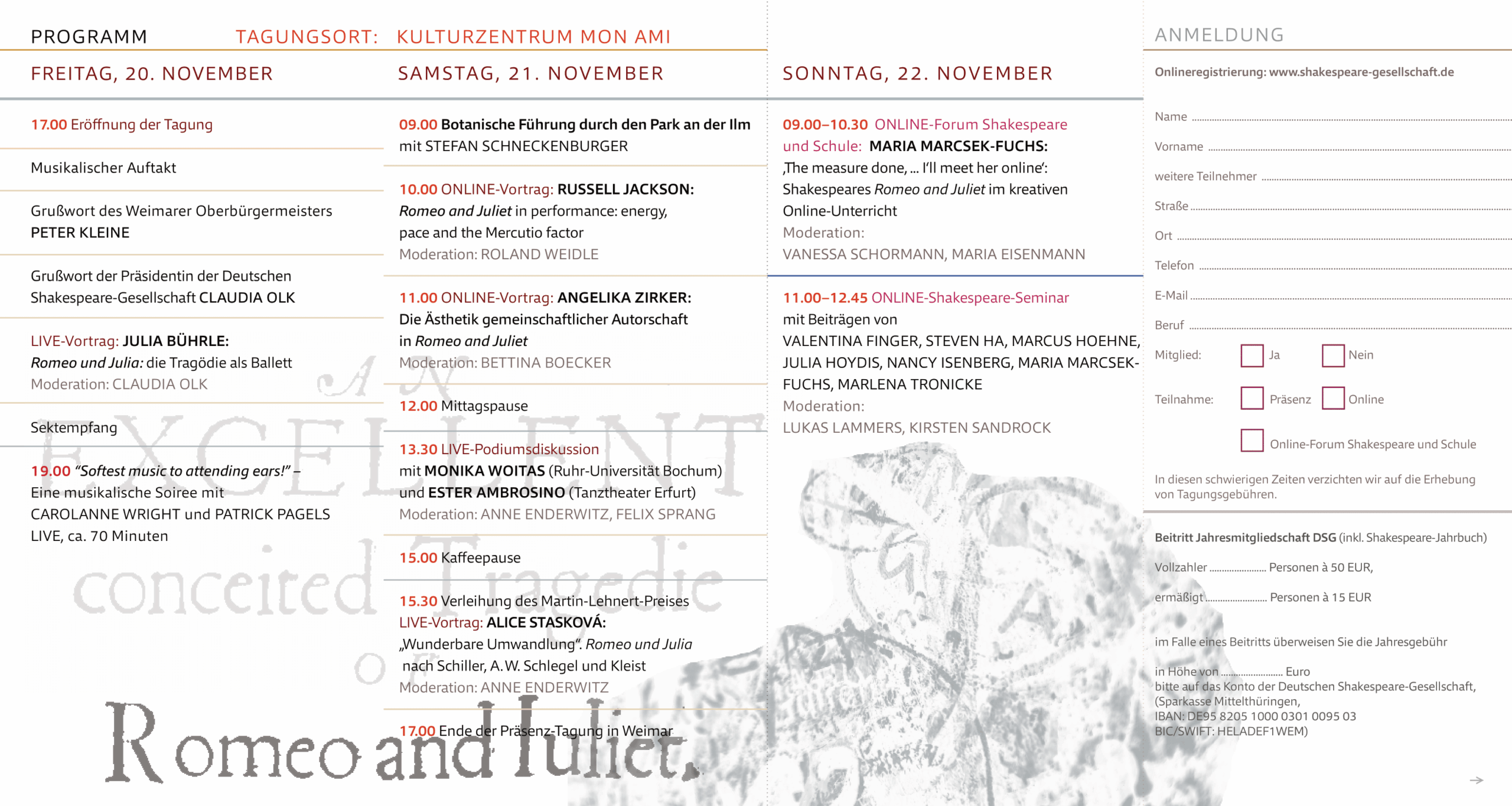 Nach der Verleihung des diesjährigen Martin Lehnert-Preises endet der Weimarer Teil der Tagung gegen 17:00. Überdies wird es Ihnen am Sonntag möglich sein, vom heimischen Schreibtisch zwei weitere Programmpunkte zu verfolgen. Im Forum „Shakespeare und Schule“ wird Maria Marcsek-Fuchs von der TU Braunschweig aktuelle Einblicke in Möglichkeiten, Romeo and Juliet im kreativen online-Unterricht zu behandeln geben, und im Shakespeare-Seminar werden junge WissenschaftlerInnen ihre Beiträge vorstellen und diskutieren. Beide Programmteile werden über eine Internetplattform angeboten werden. Die entsprechenden Zugänge werden allen angemeldeten TeilnehmerInnen rechtzeitig zugesandt. Wir bitten alle TagungsteilnehmerInnen, ob live oder online, sich zu registrieren. Als Entgegenkommen seitens unserer Gesellschaft würden wir in diesen schwierigen Zeiten einmalig auf die Erhebung von Tagungsgebühren verzichten.