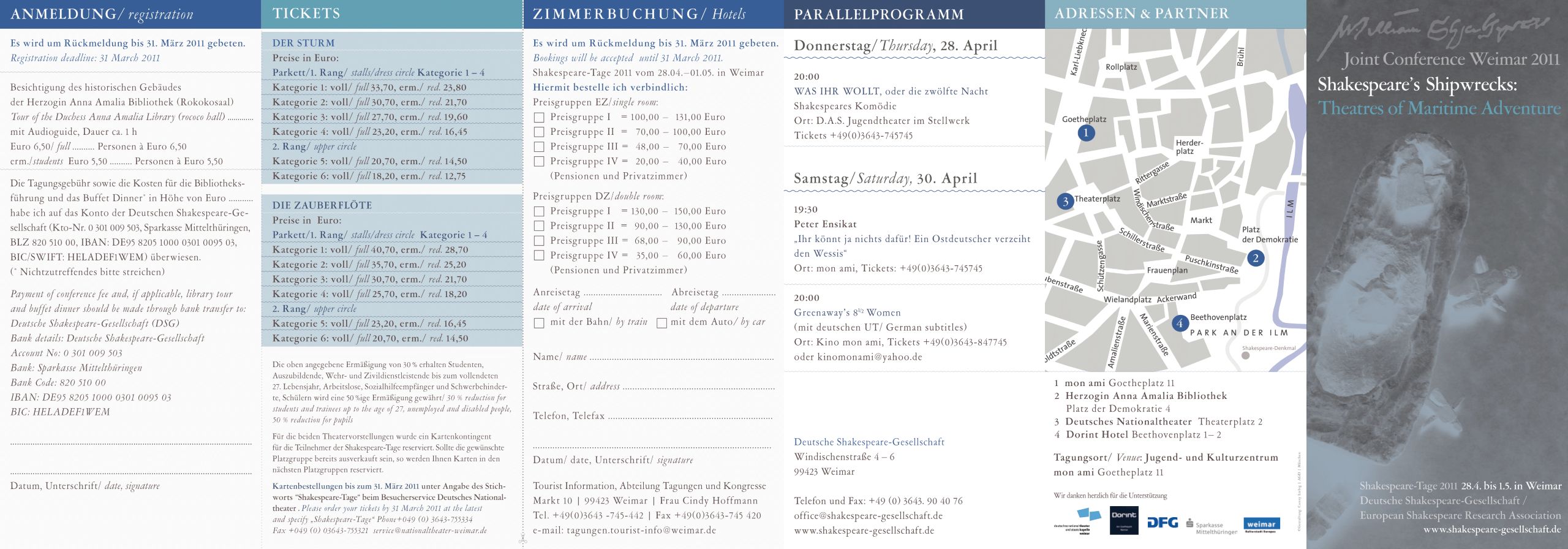 The 2011 spring conference of the German Shakespeare Society, organised in association with the European Shakespeare Research Association (ESRA), will take place 28 April – 1 May 2011 in Weimar (Germany).